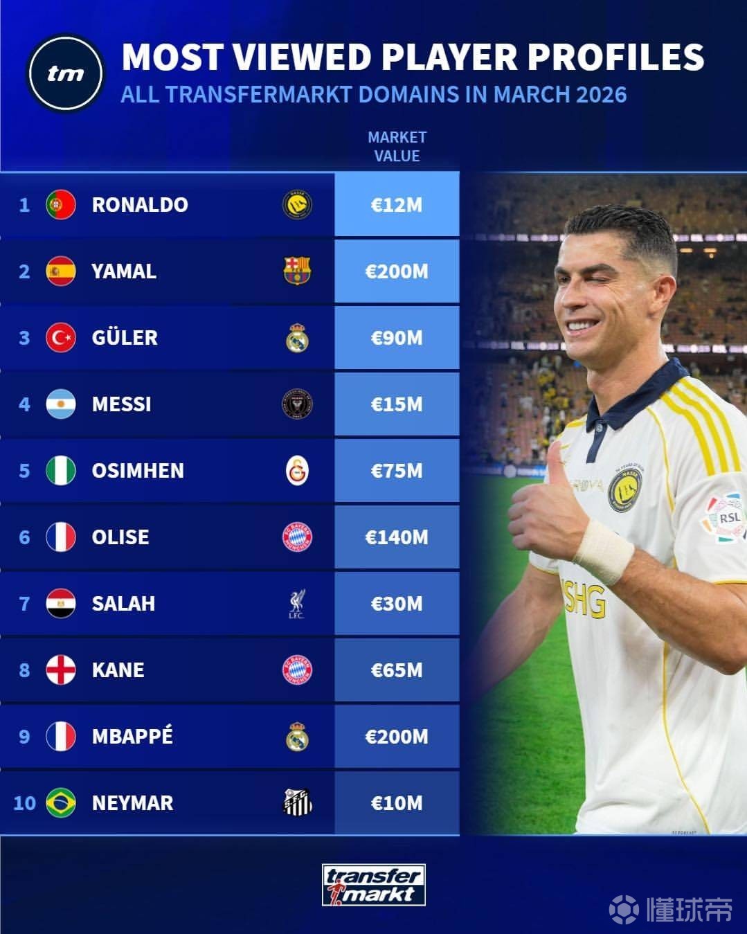 北京时间4月3日,德转发布3月球员页面浏览量排名,C罗位居第一,亚马尔、居莱尔分列二三,梅西第四。